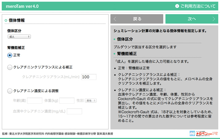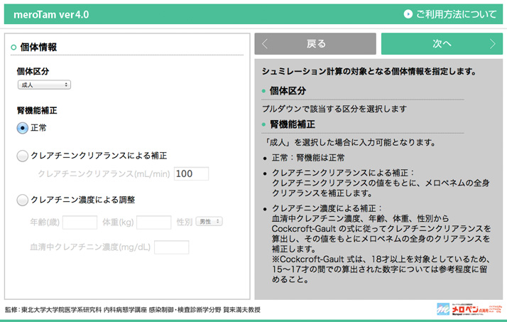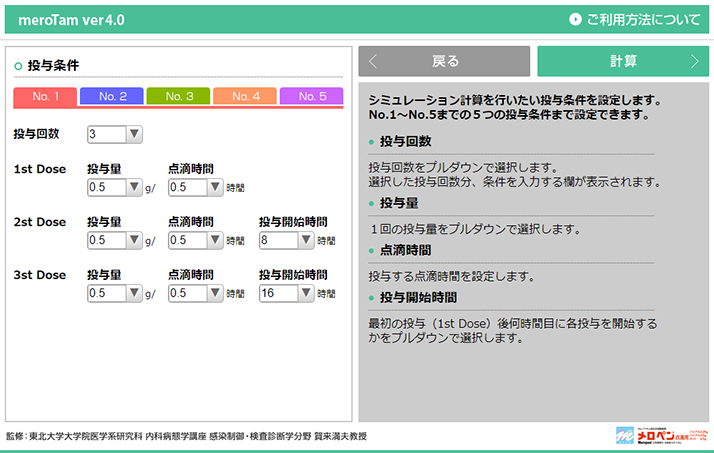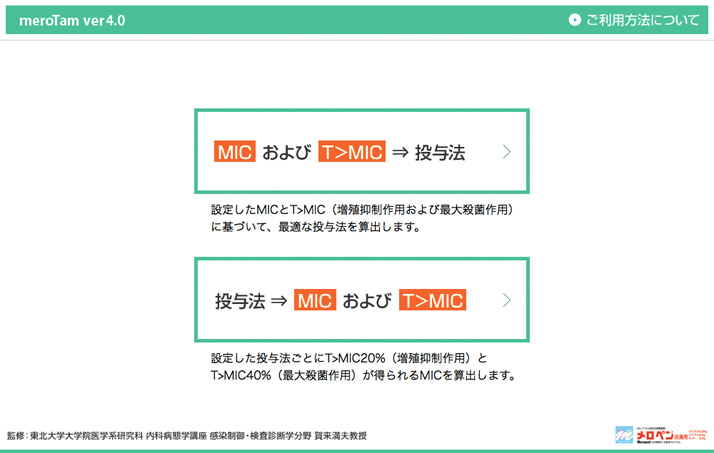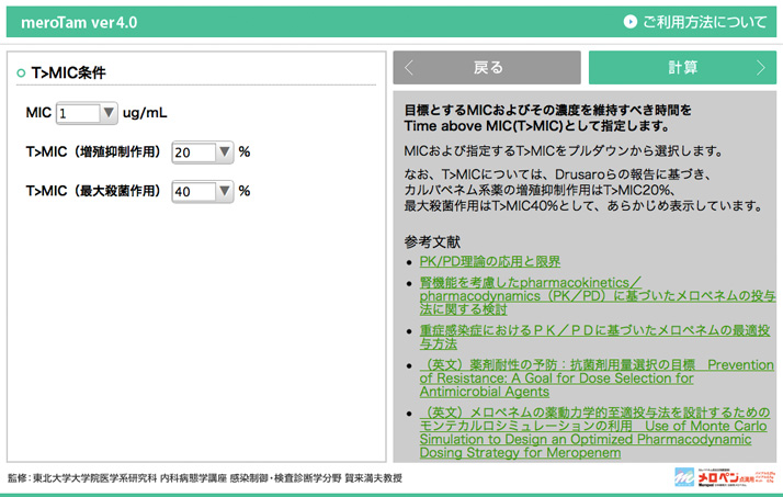 本ソフトウエアは、メロペネムの各種臨床データをもとに、指定の投与量、投与間隔で投与した時の血漿中メロペネム濃度推移およびTime above MIC、あるいは、指定のTime above MICを満足する投与条件での血漿中メロペネム濃度推移をシミュレーションします。 このソフトウエアをご使用いただくには、以下の使用条件に同意いただく必要があります。