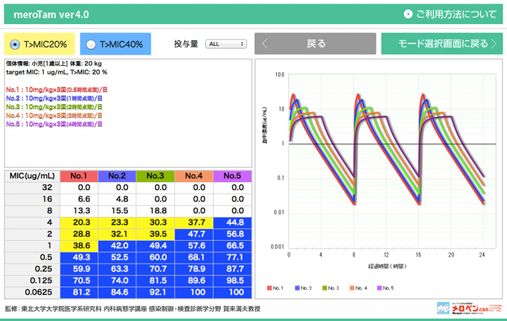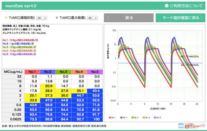 メロペン血中濃度シミュレーション&Time above MIC計算ソフト
