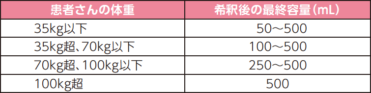 患者さんの体重と希釈後の最終容量は、下記の通り規定されています。